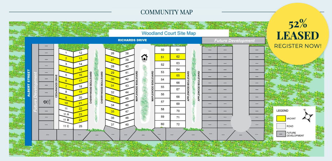 • Currently at capacity with 55 serviceable lots (with homes for sale)